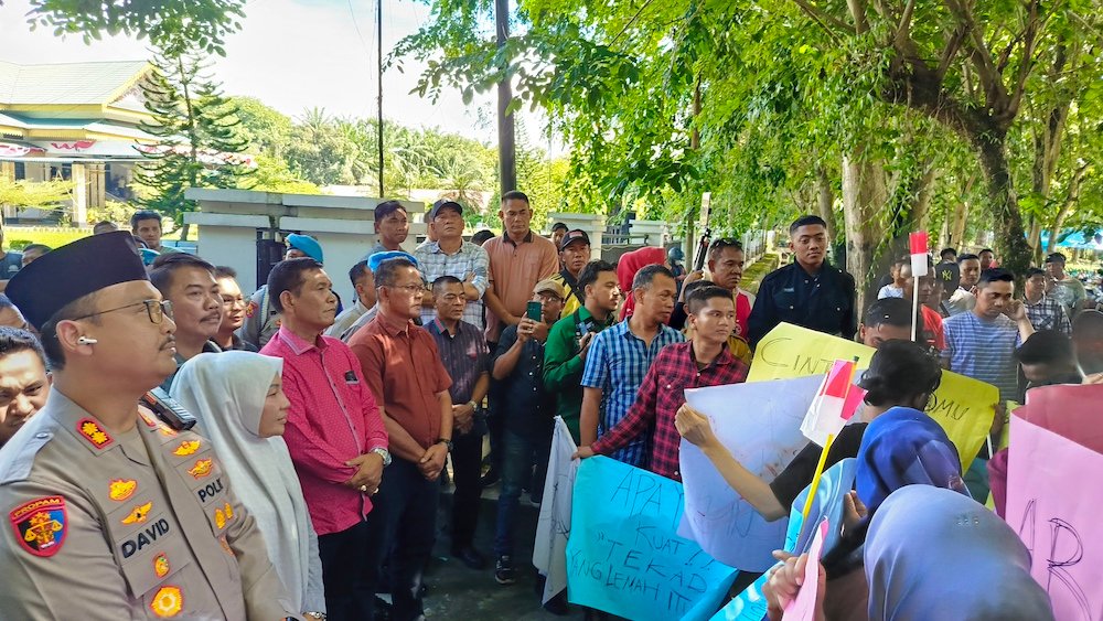 Terlihat, Ketua DPRD Langkat Sribana Perangin-angin dan Kapolres Langkat AKBP David Trio Prasojo mendengarkan aspirasi warga. Sambil mendengar lantunan Asmaul Husna dari pengeras suara, wakil rakyat dan aparat keamanan tertib menyerap tuntutan demonstran.